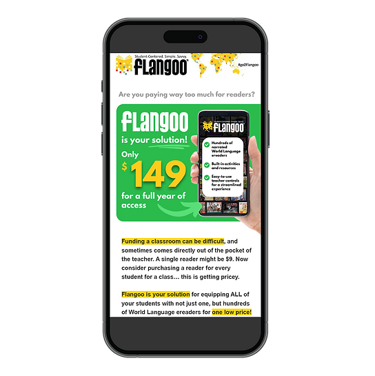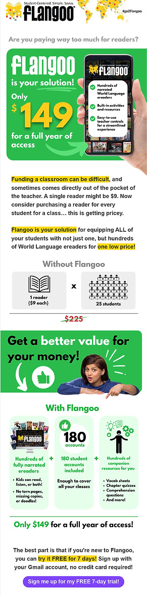 Flangoo is a digital library offering e-readers and teaching tools for pre-level 1 through level 3 Spanish, French, and German classrooms. My goal was to attract new customers and retain existing ones by reinstating weekly emails and re-establishing automated emails for current subscribers and trialists. My approach was to highlight available offers for all current customers and potential customers (free trials, subscriber discounts) while emphasizing website features and incentives (built-in narrations, comprehension activities, available titles, etc).
